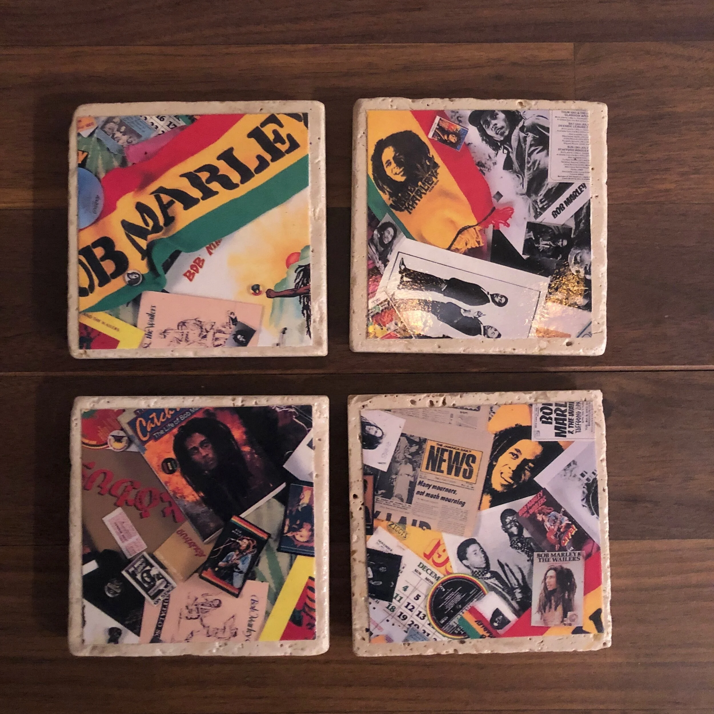 Coasters › Coasters Bob Marley Image 1 of 1 Coasters Bob Marley $20.00 Bob Marley coaster set handmade from salvaged album cover. Purchase Added! Bob Marley coaster set handmade from salvaged album cover.